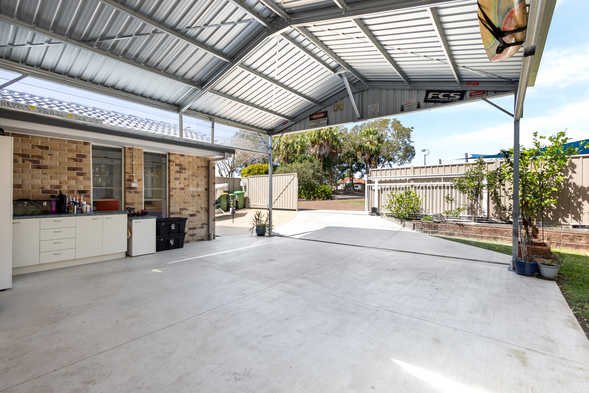 New 6x6x6 steel carport, with an additional 3m high peak ideal for parking a caravan, boat and parking for up to 5 vehicles. This carport also includes plenty of cupboards and storage as well as a workbench area for the handyperson with plenty of power points to install an electric car charging station.